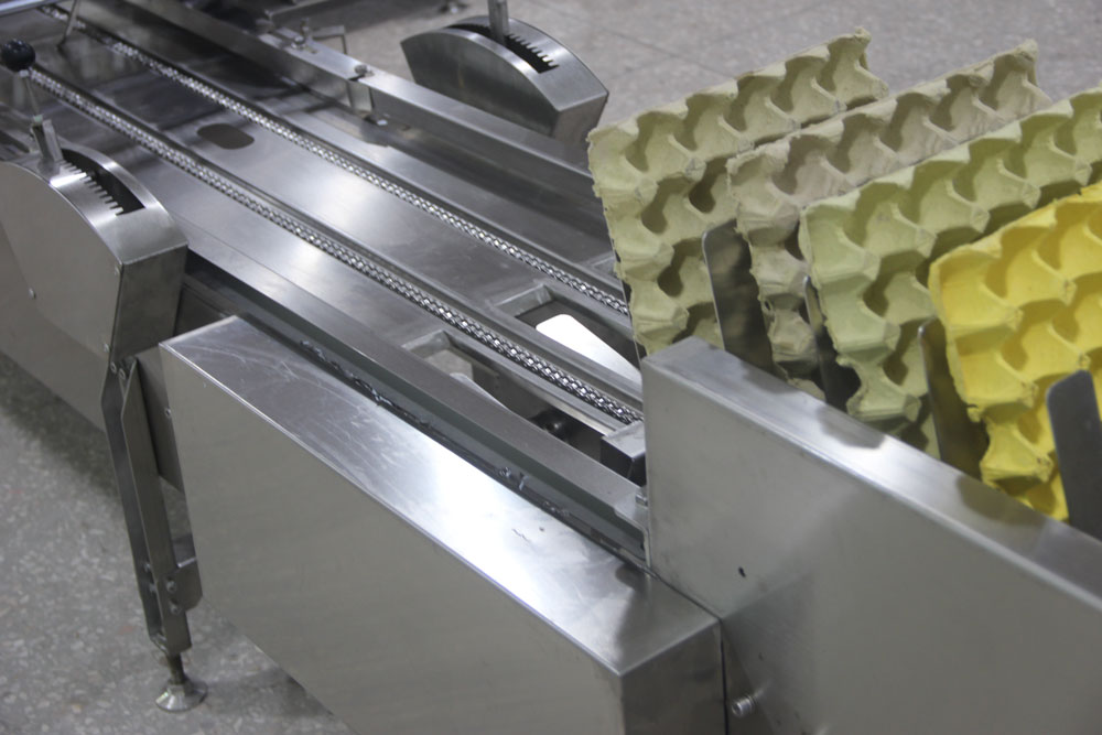 Línea totalmente automática para conectar a máquina principal de clasificación de huevos modelo 104A. Solo se Requiere 1 operador. Capacidad de envasado en bandejas de diferentes tamaños 6, 10, 12, 15, 18, 20, 24, 30 piezas.