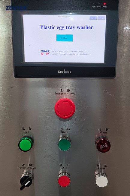 Вы можете вручную поместить стопку пластиковых лотков для яиц в бак для мойки, до 120 лотков за раз, и закрыть крышку, затем нажать кнопку запуска, машина выполнит мойку лотков автоматически.