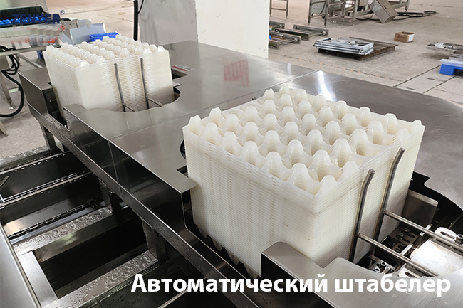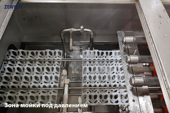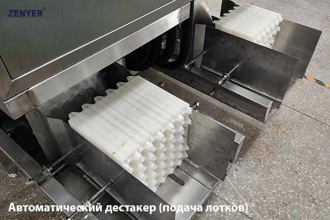 Машина для автоматической мойки грязных пластиковых лотков. Производительность рекомендуемая 2400 ячеек в час. Скорость машины регулируемая. Идеально подходит для мойки инкубационных лотков. Оснащена автоматическим загрузчиком ячеек в машину из стопки до 50*2 ячеек. На выходе автоматический штебелер уложит чистые ячейки в стопки до 80*2 штук. Две отдельные ванны: для дез раствора и чистой воды. Установлен фильтр рециркуляции воды для повторного использования. Ячейки после мойки обдуваются сжатым воздухом для сушки. Дополнительно может включаться тепловой обогрев для практически полной сушки ячеек.